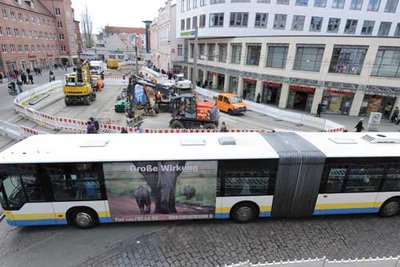 Seit Karfreitag kann der Marienplatz wieder eingleisig von Straßenbahnen befahren werden. Die Haltestellen wurden in die Wismarsche Straße und an den Totendamm verlegt. „Während des Berufsverkehrs wird die Bahn im Drei-Minuten-Takt fahren“, so NVS-Geschäftsführer Norbert Klatt. Für die Linie 2 grundsätzlich und für die Linie 1 bei Bedarf werden Doppelzüge eingesetzt. „Die Linien 5 und 7 enden und beginnen weiterhin in der Geschwister-Scholl-Straße. Dort können die Fahrgäste in die Straßenbahn umsteigen, um über den Platz und dann bis zum Hauptbahnhof zu kommen. Eine weitere Haltestelle für die Straßenbahn wurde in der Wismarschen Straße vor dem Capitol eingerichtet.“