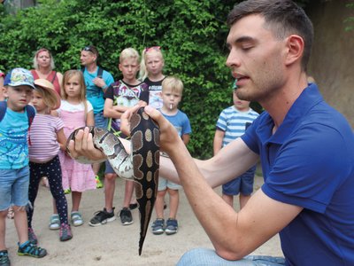 Mähnenspringer füttern, Giraffenhaare in die Hand nehmen, zwei lustigen Gibbon-Mädchen beim Hangeln zusehen und einen echten, lebendigen Königspython streicheln: Mädchen und Jungen, die vom