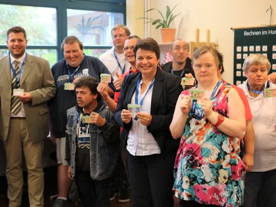 MV-Sozialministerin Stefanie Drese die ersten Schwer-in-Ordnung-Ausweishüllen in Mecklenburg-Vorpommern an 15 Mitarbeiter der Dreescher Werkstätten in Schwerin. „Mit dieser symbolischen Aktion wollen wir den Inklusionsgedanken befördern. Die Hüllen für den neuen Schwerbehindertenausweis sind ein Zeichen der Anerkennung für die Menschen mit Behinderung in unserem Land. Menschen mit Handicap sind schwer in Ordnung“, sagt Drese.