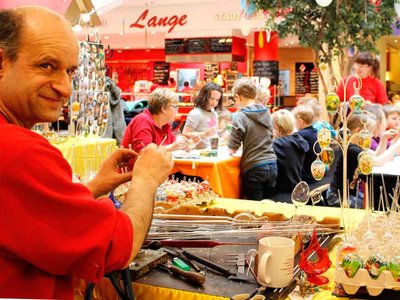 Vormittags erwartet er an seinem Stand im Untergeschoss Kita-Gruppen und Schulklassen, und an den Nachmittagen kann jeder zu ihm kommen und Glas-Ostereier bemalen. Aber nicht nur die, denn dieses Jahr bringt er auch kleine Glasfiguren für den Osterstrauß mit, zum Beispiel Entchen.