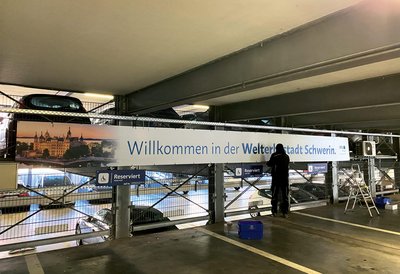 Viele Besucher kommen mit dem Auto in die Welterbestadt Schwerin. Auf dem Parkplatz an der Siegessäule werden sie jetzt von „WIR.Erfolg braucht Vielfalt“ und der Botschaft „MV tut gut.“ willkommen geheißen. Auch im Parkhaus am Schloss fällt der Blick gleich bei der Einfahrt auf einen neuen Willkommensgruß. Der 2024 erreichte Welterbe-Status hat sich bei den Gästezahlen bereits bemerkbar gemacht: Viele Besucher wollen Schloss und Altstadt sehen.