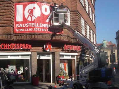Manchen Passanten kommt er schon vor wie ein alter Bekannter, der „Dino 160”. So oft, wie sich der wendige Helfer an Häuserfassaden zu schaffen macht, ist die selbstfahrende Hebebühne im Stadtgebiet mittlerweile eine kleine technische Attraktion. In stattlicher Höhe von 16 Metern kann man mit dem Multitalent arbeiten. Die Männer vom ABS-Hebebühnenverleih können auf der Bühne in luftiger Höhe mühelos Fallrohre, Dachrinnen und -giebel erreichen, und auch den Baumschnitt kann man mit Hilfe des „Dino” organisieren.