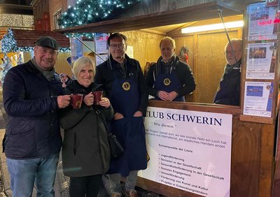 Der Lions Club Schwerin ist für jeden guten Zweck zu haben: Ehrenamtliche engagieren sich dort in vielfältiger Weise für die Belange der Gesellschaft. In der Zeit des diesjährigen Weihnachtsmarktes sammeln sie mit ihrem eigenen Glühweinstand am Marienplatz, Ecke Schlossstraße Spenden für die Schulmaterialkammer. Diese gehört zum Haus der Begegnung im Stadtteil Neu Zippendorf. Finanziell schwache Familien erhalten dort im Bedarfsfall kostenfrei Schulmaterialien wie Hefte, Stifte, Malkästen und vieles mehr.