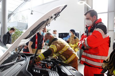 „Was muss ich machen, um bei einem Unfall mit einem Elektrofahrzeug die Hochvoltanlage abzuschalten? Kann ich die Batterie abklemmen? Und falls ja, wie bewerkstellige ich das? Wo lauern die Gefahrenstellen für mich als Retter, wenn ein Abschalten nicht möglich ist?“, zählt Hoba einige Fragen auf, die sich seine Kameraden immer wieder gestellt hätten. Antworten und praktische Anleitungen gab der Kfz-Mechatroniker Oliver Jung, der sich gut mit den E-Autos auskennt und vor Kurzem einen Hochvolt-Lehrgang absolviert hat. Alle für die Feuerwehrleute relevanten technischen Details erläuterte er an einem Audi-Q3-Hybriden und einem rein elektrisch betriebenen Audi Q4 e-tron. Dazu gibt es auch sogenannte Rettungskarten, auf denen die Position der Elektroanlagen übersichtlich dargestellt ist. Im Idealfall liegen die Karten schnell auffindbar im E-Auto.