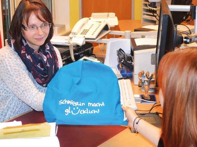 Zur Begrüßung erhalten sie im Bürgerbüro des Stadthauses mit der Anmeldung auch ein kleines Willkommensgeschenk. Dieses Neubürgerpaket enthält neben wichtigen Informationen über die Stadt zahlreiche Gutscheine und ist schön verpackt in einem umweltfreundlichen blauen Rucksack aus Jute mit der Aufschrift „Schwerin macht glücklich“.