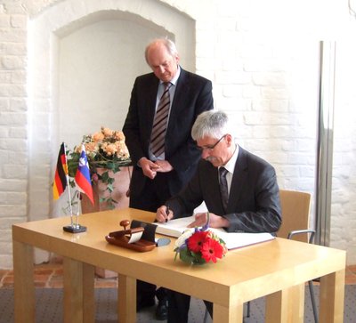 Der stellvertretende Oberbürgermeister Dr. Wolfram Friedersdorff empfing am 22. April den slowenischen Botschafter, S.E. Mitja Drobnič, im Alten Ratssaal des Rathauses, der in Begleitung des Botschaftsrates für Wirtschaft, Damir Devčič, reiste. Der hohe Gast, der seit April 2009 diese Aufgabe in Berlin wahrnimmt, trug sich im Anschluss an die Begrüßung in das Goldene Buch der Landeshauptstadt ein. Zur Erinnerung an den Besuch in der Jubiläumsstadt bekam S.E. Mitja Drobnič ein Buch über Schwerin geschenkt. In einem späteren Gespräch kamen vorrangig die wirtschaftliche und touristische Entwicklung beider Länder zur Sprache. Aber auch die Feierlichkeiten anlässlich des 850. Geburtstages der Landeshauptstadt in diesem Jahr standen auf der Agenda. Darüber hinaus gab es an diesem Tag noch Gespräche mit dem Ministerpräsidenten Erwin Sellering, dem Präsidenten der Industrie- und Handelskammer Hans Thon sowie der Leiterin des Geschäftsbereiches Standortpolitik international Angela Preuß und der Präsidentin des Landtages Mecklenburg-Vorpommern Sylvia Bretschneider.
