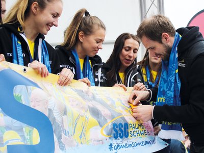 Zwei Tage, nachdem sie die Deutsche Meisterschaft also in der Fremde klargemacht hatte, präsentierte sich die Mannschaft den Fans in Schwerin bei einem Autokorso, der sie zu einem Fan-Empfang am Südufer des Pfaffenteichs führte. Vorher Zwischenhalt an der Staatskanzlei, wo Ministerpräsidentin Manuela Schwesig dem Drei-Sterne-Team zum Titel gratulierte. Nachdem der SSC nun zum zwölften Mal die nationale Meisterschaft siegreich beendete, darf er den dritten Stern führen.