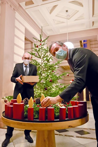 Der Landespastor für Diakonie Paul Philipps (l.) überreichte am 1. Dezember im Namen der gesamten Diakonie MV einen Nachbau des Original-Adventskranzes nach Johann Hinrich Wichern an den Chef der Staatskanzlei Herrn Dr. Heiko Geue (r.) in Vertretung für Ministerpräsidentin Manuela Schwesig. Die Leihgabe mit ihren 24 Holzkerzen schmückt noch bis Anfang Januar die Staatskanzlei. Der Kranz wurde 2011 in einer Rostocker Werkstatt für Behinderte angefertigt.