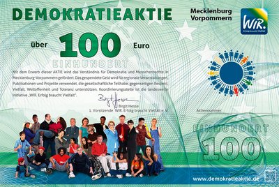 Mit der DEMOKRATIEAKTIE werden regionale Vorhaben unterstützt, zum Beispiel Demokratie- und Bürgerfeste, Konzerte bis hin zu Buchlesungen und Workshops. Machen Sie mit! Eine DEMOKRATIEAKTIE lässt sich bereits mit 5 Euro erwerben. Nennwerte von 50, 100, 500, 1000 und 5000 Euro sind ebenso möglich. Jede Unterstützung zählt! Mitmachen kann jeder, der die Werte des Grundgesetzes vertritt und sich mit uns für ein demokratisches, weltoffenes Mecklenburg-Vorpommern stark macht.