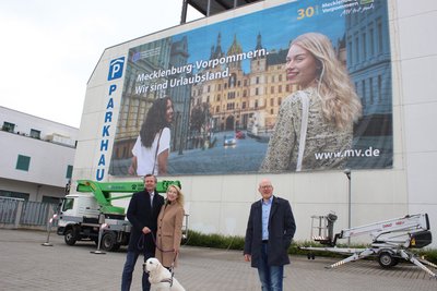 Dr. Heiko Geue, Chef der Staatskanzlei MV, sagt: „Wir freuen uns, wenn die Menschen zu uns in den Urlaub kommen.“ Und so steht auf dem neuen Riesenbanner, das am 25. Mai am Parkhaus an der Graf-Schack-Allee enthüllt wurde: „Mecklenburg-Vorpommern. Wir sind Urlaubsland.“