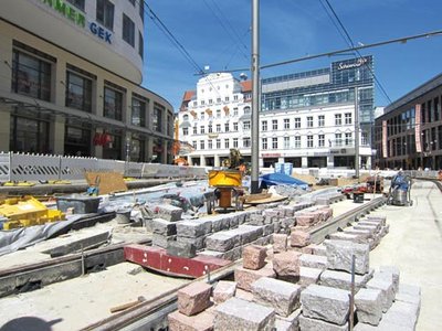 Pflastern entsprechend angezogen. Ab 10. September (bislang war der 6.8. der Stichtag) soll schließlich der Nahverkehr wieder wie gewohnt den Platz queren. Fünf Wochen länger als geplant fahren die Busse also durch die Mecklenburgstraße.