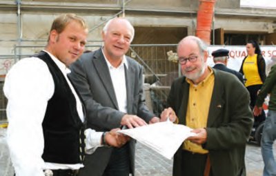 „... Und stolz und froh ist jeder heute, der tüchtig mit am Werk gebaut. Es waren wackre Handwerksleute, die fest auf ihre Kunst vertraut. ...” tönte es aus luftiger Höhe am 24. September 2010 in der Buschstraße. Investor Dr. Horst Brandt (Mitte, mit Dachdeckermeister Axel Beifuss und Architekt Werner Teltscher) hatte zum ersten Richtfest auf die Großbaustelle Schloss-Quartier geladen. Mit Hochdruck wird derzeit auf der 2.200 Quadratmeter großen Baustelle zwischen Schloss-, Busch-, Schuster- und Enger Straße gebaut. Das Areal soll Ende 2011 bezugsfertig sein.