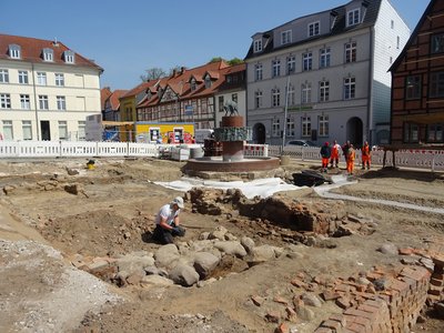 Die Grabungen erfolgten in Absprache zwischen dem Landesamt und der Landeshauptstadt als Auftraggeberin bis zu einer Tiefe von 1,50 Metern entlang der jeweiligen Leitungstrassen, Hausanschlüsse und an den Baumstandorten. Baudezernent Bernd Nottebaum sagte beim Ortstermin auf dem Schlachtermarkt: „Wir befinden uns hier auf stadtgeschichtlich interessantem Terrain, sodass wir selbst sehr gespannt auf den archäologischen Abschlussbericht sind. Wir bedanken uns für die Unterstützung des Landesamtes für Denkmalpflege bei der archäologischen Begleitung dieser wichtigen Baumaßnahme. Es gab viele Funde, die Stadtgeschichte müssen wir aber nicht umschreiben. Und auch der Bauablauf wurde nicht beeinträchtigt, denn die Grabungen wurden bei der Planung berücksichtigt.“ Es wird weiterhin von einer Gesamtbauzeit der Maßnahme bis Ende April 2020 ausgegangen.