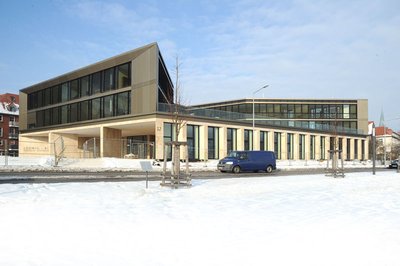 Im Januar sind die Mitarbeiter der Industrie- und Handelskammer zu Schwerin in das neue Ludwig- Bölkow-Haus umgezogen. 1300 Quadratmeter Bürofläche und 830 Quadratmeter Veranstaltungsfläche stehen hier zur Verfügung – und damit ausgezeichnete Arbeitsbedingungen. Dass es so ist – daran haben auch zahlreiche Baufi rmen einen Anteil. Zu ihnen gehören die WIBAU Haustechnik GmbH aus Schwerin, die Müritzer Bodenausstattung GmbH aus Waren und die Firma Rumpf Garten- und Landschaftsbau GmbH aus Rampe. Das Gebäude an der Graf-Schack-Allee ist nicht nur außen ein Hingucker. Hinter der modernen Hülle verbirgt sich ein modernes Innenleben. Eine ausgeklügelte Nutzung von Geothermie ist nur ein Beispiel dafür. Installiert wurde die Geothermiezentrale von der Firma WIBAU, welche die komplette Haustechnik im neuen Ludwig-Bölkow-Haus realisierte. Für das Schweriner Unternehmen ist die Betreuung großer Projekte kein Neuland: In der gesamten Bundesrepublik, mit dem Schwerpunkt in Norddeutschland, hat sich die Firma als haustechnischer Komplettanbieter einen guten Namen gemacht. Im Ludwig-Bölkow-Haus installierten Mitarbeiter der WIBAU neben der Geothermieanlage unter anderem die Lüftungsanlage und bauten Umluftkühlgeräte zur Kühlung der Serverräume, die Gasanlage und eine Begleitheizung ein – ein gutes Beispiel für die Leistungskraft einheimischer Unternehmen.