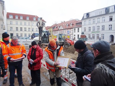 Die archäologische Begleitung der Tiefbauarbeiten auf dem Schlachtermarkt wird nach Angaben der Tief- und Kulturbau GmbH (TuK) planmäßig noch bis März dauern. TuK-Bauleiter Achim Nowak sagt, die Grabungen seien bei der Planung des Bauablaufs von vornherein berücksichtigt worden. Sie umfassen in Absprache mit dem Landesarchäologen Dr. Detlef Jantzen und der Landeshauptstadt als Auftraggeberin der Platzsanierung die jeweiligen Leitungstrassen, Hausanschlüsse und Baumstandorte bis zu einer Tiefe von 1,50 Metern.