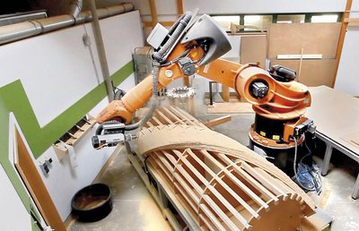 Holzbauteile mit vertrackten Formen – mehrfach gekrümmt! – mit wirtschaftlich vertretbarem Aufwand produzieren, wie geht das? Bei der Tischlerei Eigenstetter hatte man die zündende Idee: per Robotertechnik. Was in der heutigen durchelektronisierten Welt so einleuchtend klingt, war jedoch für die Handwerksfachleute des Rehnaer Betriebes gar nicht so leicht umzusetzen. Holz ist ein Naturbaustoff und dementsprechend sanft zu behandeln. Die Wuchsrichtung spielt bei der Bearbeitung eine Rolle, und das Werkstück muss beim Fräsen fest eingespannt werden, ohne dass es beschädigt wird und ohne dass die Haltevorrichtung den Roboterarm stört.