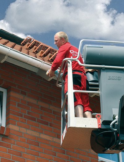Jens Suhr erreicht mit „Dino 160”, der selbstfahrenden Hebebühne stattliche 16 Meter. So kann der Mann vom abs Hebebühnenverleih mühelos Fallrohre, Dachrinnen und -giebel erreichen.