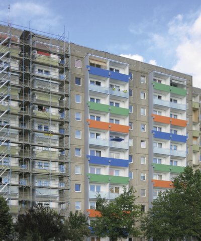 Anschließend erhält jeder Balkon einen weißen Innenanstrich. Die Brüstungen werden die Genossenschaftsfarben Orange, Grün oder Blau erhalten. „Wir wollen uns”, sagt Abteilungsleiterin Gabriele Szymanski, „mit dieser Baumaßnahme auch zum Stadtteil Mueßer Holz bekennen.”