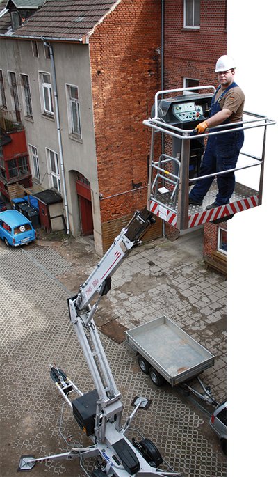 Dank der maximalen Arbeitshöhe von 16 Metern erreichen die Mitarbeiter von ABS oder jeder, der sich die Hebebühne für den Privatgebrauch ausleiht, mühelos die oberen Enden von Fallrohren, Baumkronen, Dachrinnen und Giebeln. Außerdem ist die selbstfahrende Hebebühne praktischerweise nicht nur höhenverstellbar, sondern dazu auch in der Lage, versetzt in verschiedenen Winkeln zu arbeiten. Transportiert werden kann das Gerät einfach mit einem größeren Pkw, der über eine Hängezugvorrichtung verfügt. Direkt bis an die Arbeitsstelle wird der „Dino“ mit einem Selbstfahrmotor justiert, so dass die Hebebühne auf der Baustelle oder zu Hause exakt bis an die gewünschte Stelle heran manövriert werden kann. Nach dem Frühjahrsputz nahtlos übergehen zum Arbeitseinsatz für den Sommer? Selten hat das so viel Spaß gemacht wie mit dem höhentauglichen „Dino 160“!