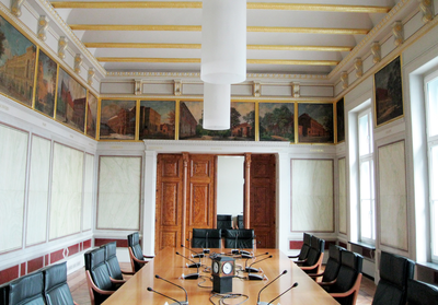 Innen öffnet sich seit dem Wiederaufbau durch Willebrand ein prächtiges Vestibül, golden schimmert das Geländer im repräsentativen Treppenhaus. „Allerdings handelt es sich lediglich um Schlagmetall, das nur so glänzt, als wäre es Gold“, berichtet Marita Moritz, Mitarbeiterin der Pressestelle der Staatskanzlei , von den kleinen „Schummeleien“ im Dienste der Eleganz. Und auf Eleganz wurde natürlich größter Wert gelegt. Davon erzählt heute zum Beispiel der ehemalige Kollegiensaal im zweiten Obergeschoss, der mit seiner reich verzierten Stuckdecke und dem diagonal verlegten Tafelparkett zu den besonders reich ausgestatteten Räumen gehört. Blickfang ist ein Bilderfries mit 24 Gemälden, die die Ämter des Großherzogtums zeigen. Geschaffen wurde der Zyklus von dem Wismarer Maler Friedrich Jentzen, der auch die Fresken großherzoglicher Schlösser und Landsitze malte, die heute in der Schlössergalerie des Schweriner Schlosses zu sehen sind.
