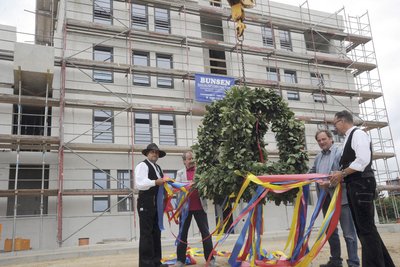 Vor etwa einem Monat wurde im Baugebiet Waisengärten Richtfest gefeiert: Das Grundstücks- und Erschließungskontor (gek) aus Banzkow ließ einem der drei dort entstehenden „Schwanenwieck“-Stadthäuser die Krone aufsetzen.