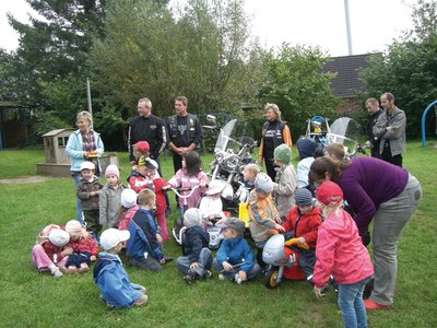 Wie es der Zufall will, hat Sybille Koppelwiser auch den nahe liegenden Harley-Davidson Händler Udo Müller und das dort ansässige HOG-Chapter überzeugen können, sich für die Knirpse ins Zeug zu legen. Die Mitglieder des Mecklenburg-Chapter-Schwerin, zu dem auch Sybille Koppelwiser gehört, sammeln nun jedes Jahr Geld für die Kita, um Geschenke für die Kinder anzuschaffen. „Im vergangenen Jahr standen alle Kinder auf dem Hof und warteten voller Ungeduld, bis das Tor geöffnet wurde und die Harleyfahrer auf ihren Maschinen hereingefahren kamen“, erinnert sich Jenny Görtz. Sie brachten Spielfahrzeuge mit, auf denen Harleyaufkleber prangten. Die wurden von den Kindern gleich in Beschlag genommen. Auch in diesem Jahr werden die Harley-Freunde die Geburtstags-Kita nicht vergessen. Zur 40-jährigen Jubiläums-Festwoche vom 7. bis 10. Juni wollen sie auf jeden Fall vorbeischauen. Und auch das Sanitätshaus Kowsky wird dann mit von der Partie sein. Ein Geschenk gab es schon mal vorab, damit die jüngsten Integrationskinder nicht zu lange warten müssen. Jenny Görtz nahm die aus bunten Klettelementen zusammensetzbare therapeutische Lagerungshilfe mit dankenden Worten entgegen. „Sie wird den Erzieherinnen sicher eine gute Hilfe sein.“ Einen Wunsch hatte Jenny Görtz als Geburtstagsgeschenk für ihre Kita dann aber doch noch: „Ich würde mich freuen, wenn es schon bald mit der Sanierung unserer Einrichtung klappt.“