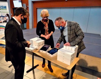 Die ersten Tablets überreichte Oberbürgermeister Rico Badenschier zusammen mit Matthias Effenberger, Vorstand des Kommunalservice Mecklenburg (KSM) an Vera Arndt, Leiterin der Integrierten Gesamtschule „Bertolt Brecht“. Weitere iPads wurden zum Start an die Erich-Weinert-Schule, die Siemens-Schule, die Regionalschule Weststadt-Campus, die Astrid-Lindgren-Schule, das Goethe-Gymnasium, das Sportgymnasium und das Gymnasium Fridericianum übergeben.