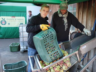 Lunau hatte die sechs jungen Leute eingeladen, bei der Produktion von Apfelsaft mitzuwirken. Sie durchliefen dabei drei Stationen: die Obstannahme mit direktem Kundenkontakt, die Bedienung der hochmodernen Presse und die Abfüllung des Safts nach dem Bag-in-Box-Prinzip.