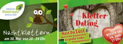 Kletterdating: Alle kletterbegeisterten Singles ab 18 Jahre können sich und den potentiellen Partner am 14. Juni in ungewöhnlichen Situationen testen. Bei der unvergesslichen Wanderung in den Baumwipfeln kann man neue Leute oder sogar die große Liebe kennen lernen. Nach dem Klettern durch die Parcours klingt der Abend am Lagerfeuer und Grillbuffet aus (Preis pro Person 35 Euro). Anmelden einfach bis 12. Juni unter 03 85 / 5 89 45 51 oder info@schweriner-kletterwald.de.