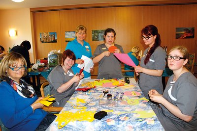 Passend zum Osterfest gestalteten die Mädchen und jungen Frauen Holz-Osterhasen, bastelten Schmetterlinge, bemalten Ostereier, fertigten Blumenschmuck an und vieles mehr, zum Schluss dekorierten die zwölf Lehrlinge kleines Ostergebäck – in insgesamt sechs Stunden konzentrierter Arbeit in sieben Wohnbereichen, die allen Beteiligten Spaß, aber auch neue Erkenntnisse brachte. Lohn für die Mühen waren der Dank und die Freude der 281 Bewohner, aber nicht nur. Denn eine Jury, die unter anderem aus der Einrichtungsleitung, dem Bewohnerbeirat und Angehörigen von Bewohnern bestand, vergab für die Leistungen der Auszubildenden Punkte und ermittelte die Gewinnerin des Wanderpokals: Line Mulfinger. Sie absolviert ihre Ausbildung im Hotel Gutshaus Stellshagen und befindet sich für etwa zehn Wochen im Jahr in Verbundausbildung bei der SBW.