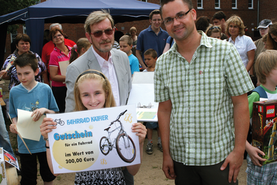 Preisträgerin Anna Porath (10) suchte sich ein Fahrrad als Belohnung für ihren tollen Text über ein Schauspielerinnen-Leben aus. Fahrrad-Fachverkäufer Fabian Teichert von der Firma Fahrrad Kather, die - unterstützt von der DKB-Bank - zwei Räder als Preise zur Verfügung stellte, freute sich mit ihr und verabredete sich noch an Ort und Stelle mit der jungen Schriftstellerin: „Komme mit Deinen Eltern in unser Geschäft. Dann werden wir Dir Dein neues Fahrrad maßschneidern.” Dr. Thomas Spribille, leitender Arzt des Kinderzentrums, lobte die Kreativität der über 300 Mädchen und Jungen, die ihre Gedanken zum Thema „Wenn ich einmal groß bin ...” zu Papier brachten.