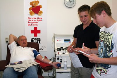 Philipp Walber und Lucas Konnigk hat besonders die Frage interessiert, was Menschen dazu bewegt, Blut zu spenden. Erfahren konnten sie das von Axel Walter. Der Hagenower kommt regelmäßig nach Schwerin zum DRK. „Es ist einfach wichtig, weil das Blut gebraucht wird. Es passieren leider tagtäglich schwere Unfälle. Gerade im Sommer kommt es schnell zu einem Notstand bei den Blutbanken. Da möchte ich helfen“, erzählte Axel Walter den beiden Elftklässlern. Außerdem habe er so die Möglichkeit, seine eigenen Werte regelmäßig kontrollieren zu lassen.