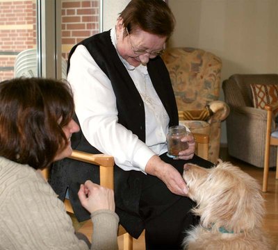 Lässig streift Rodo durch die Flure und Aufenthaltsräume des Wohnbereichs 1 im Augustenstift. Der Gos d‘ Atura-Mischling mit dem cremefarbenen Wuschelfell ist seit Monaten der Liebling bei den Pfl egeheim-Bewohnern. Überall wird er freudig begrüßt: „Rodo, ich habe wieder etwas für dich!”, „Da ist ja unser Süßer!” ... - Der Hund kennt das, er arbeitet schließlich hier. „Rodo wird in der tiergestützten Therapie eingesetzt”, erzählt Frauchen Carolin Fahlenbock. Er soll zum Beispiel Demenzkranken helfen, Bilder oder Erlebnisse aus ihrer Vergangenheit zu „holen”. Doch bis dahin war es ein weiter Weg. Die Frau, die im Betreuten Wohnen des Augustenstifts tätig ist, hat die Art und Weise, wie man mit Tieren in der Therapie arbeiten kann, immer bewundert. Da sie praktisch mit Hunden aufgewachsen ist, kann sie sehr gut einschätzen, wieviel Mühe und Beharrlichkeit man für die Ausbildung dieser Vierbeiner benötigt. Ihre Tierliebe und die Berufung, für Menschen da zu sein, „verbündeten” sich mit der Zeit dermaßen, dass 2007 ihre Überlegungen und Wünsche konkreter wurden, sich - und natürlich ihren Kindern - ein Haustier anzuschaffen.