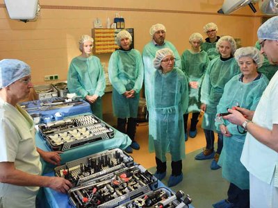 Zum einen gab es Gelegenheit, die Mitarbeiter kennen zu lernen, die auf unterhaltsame Weise über ihre Arbeit berichteten. Zum anderen – darüber freuten sich die meisten Gäste ganz besonders – konnten sie sich in Bereichen umschauen, die sonst nicht öffentlich zugänglich sind, und selbst mal „Chirurg“ sein. Unter sachkundiger Anleitung versuchten sich so manche an einem Knie-Modell. Zuvor hatte Leipe – ebenfalls anhand eines Modells – gezeigt, wie ein künstliches Gelenk eingesetzt wird.