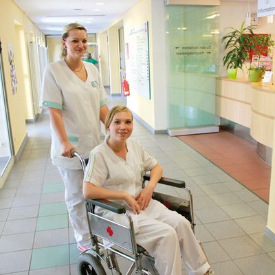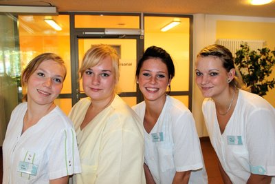 Jede der vier jungen Frauen ist einer anderen Station zugeteilt. Sarah Koschek zum Beispiel ist in der Funktionsdiagnostik unter anderem für das Holen und Bringen der Patienten zu und von den unterschiedlichen Untersuchungen zuständig. „Dabei trägt sie eine nicht zu unterschätzende Verantwortung“, betont ihre Chefin, die Pflegedienstleiterin Anja Trilk. „An dieser Stelle ist Eigenmanagement und Organisationstalent gefragt.“ Schon am zweiten Tag durfte Sarah Anfang September bei einer Darmspiegelung zusehen. Für ihre Mitstreiterin Viola Schäffer in der Orthopädie war der erste Verbandswechsel eine beeindruckende Erfahrung.