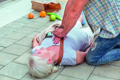 Trotzdem: Das Deutsche Rote Kreuz empfiehlt, Kenntnisse in der Ersten Hilfe alle zwei Jahre aufzu- frischen. Das sorgt für die richtige Routine – und im Fall des Falles für weniger Nervosität. Aber nicht nur im Straßenverkehr gibt es Situati- onen, die schnelles Handeln erfor- dern. Auch im Supermarkt, im Schwimmbad oder im Schrebergar- ten kann es wichtig sein – wenn zum Beispiel jemand einen Kreislaufstillstand erleidet. Stolpert das Herz oder setzt die Atmung aus, ist es wichtig, so schnell wie möglich mit Wiederbelebungsmaßnahmen zu beginnen. Die Merkhilfe für diese Situation lautet „Prüfen – Ru- fen – Drücken“: Zuerst wird kontrolliert, ob jemand auf Ansprache oder Anfassen reagiert (prüfen). Ist das nicht der Fall und fehlen Atem- geräusche und Bewegungen des Brustkorbs, muss zuerst der Not- dienst gerufen werden (rufen). An- schließend beginnt sofort die Wie- derbelebung (drücken). Für die Herzdruckmassage knien Helfer neben dem Bewusstlosen. Eine Hand wird auf die Mitte des Brust- korbs gesetzt, die andere darauf, so, dass sich die Finger verschränken. Jetzt wird der Oberkörper nach vorn verlagert und der Brustkorb mit gestreckten Armen fünf bis sechs Zentimeter tief eingedrückt – zweimal in der Sekunde. Ein hilfreicher Rhythmus, um im Takt zu bleiben, ist das Lied „Stayin‘ Alive“ von den Bee Gees. Die Herzdruckmassage muss so lange aufrecht erhalten werden, bis die professionellen Helfer eintreffen. In solchen Fällen kann Erste Hilfe Leben retten.