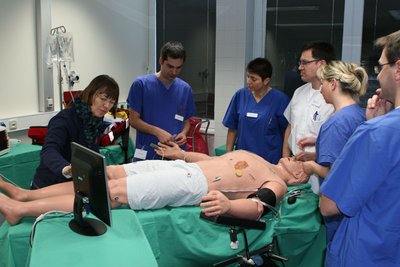 In den HELIOS Kliniken steht an diesem Tag eine Schulung im so genannten Zwischenfallmanagement auf dem Plan. Matina Heinrichs hat die „Patientendaten“ in einen Rechner eingegeben, der direkt mit dem „künstlichen Patienten“ auf dem Untersuchungstisch verbunden ist. Nun beginnt das Team mit der Gastroskopie. „Frau Dükerhoff “ erhält eine Sedierung – ein beruhigendes Medikament, das ihr eine schmerz- und stressfreie Untersuchung ermöglicht. Dass „nur“ eine Puppe auf dem Untersuchungstisch liegt, ist schnell vergessen. Denn es muss Hand in Hand gehen, als der Kreislauf der Patientin instabil wird. Dass Team erkennt, dass eine Magenblutung die Ursache ist, legt sofort eine Infusion an und führt eine Intubation durch, um die Atemwege zu schützen und das Eindringen von Blut in die Lunge zu verhindern. Die Untersuchung kann danach planmäßig beendet werden. „Das war fachlich super gut“, lobt Dr. Heinrichs bei der Auswertung. „Die Mitarbeiter haben anhand der Symptome die Magenblutung erkannt und die richtigen Schritte eingeleitet. Sie haben außerdem richtig festgestellt, dass die Patientin von Anfang an eine zusätzliche Sauerstoffzufuhr brauchte.“