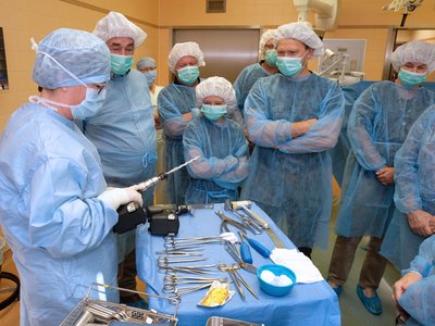 Einer der beliebtesten Anlaufpunkte an diesem Tag war zweifellos der Operationssaal. Klein und Groß, Jung und Alt zeigten hier großes Interesse. Nachdem sich die Besucher aus hygienischen Gründen die entsprechende Schutzkleidung angezogen hatten, konnten sie gemeinsam mit Ekkehard Leipe, dem Chefarzt der Klinik für Orthopädie und Chirurgie, den OP-Saal betreten.