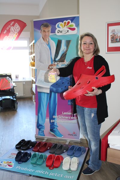 Oder eine Gelegenheit, in die Duflex-Schuhe zu schlüpfen: Die bunten Clogs aus Naturkautschuk mit den dicken Sohlen haben ne- ben der wohltuenden Wirkung für Fersensporn-Geplagte weitere Vorteile. „Wer zum Beispiel Pro- bleme mit den Bandscheiben hat, findet hier Entlastung. Die weiche Sohle aus Naturkautschuk nimmt Druck weg und federt beim Auf- setzen“, sagt Susanne Reichelt. Aus diesem Grund sind die Schu- he bei Knöchel-, Knie- und Rü- ckenproblemen ein Gewinn und wer sie einmal schätzen gelernt hat, möchte sie meist immer wie- der anziehen. Ein Riemen sorgt optional für sicheren Halt, wer mag, kann die Schuhe aber auch als Clogs tragen. „Die knalligen Farben bringen gute Laune in den Frühling“, sagt Susanne Reichelt und macht gleich noch auf einen weiteren Vorteil aufmerksam: Die Duflex-Schuhe von Chung Shi haben vom Magazin Öko-Test die Note „Sehr gut“ erhalten und las- sen sich dank des schadstofffreien Naturkautschuks auch barfuß tragen.
