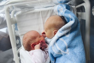 Ziemlich genau 37 Wochen hatten Lydia Prehn und ihr Mann Zeit, sich auf ihr doppeltes Glück einzustellen. Umso größer war die Freude, als Luise und Gustav gesund und munter am 22. November in der gleichen Minute und mit gleich großen 49 cm das Licht der Welt erblickten. Mit 3180 g brachte die Schwester ein paar hundert Gramm mehr mit als ihr Bruder. Innig kuscheln sie sich im Babybettchen aneinander, Mama und Papa können jetzt gemeinsam in die Elternzeit gehen.
