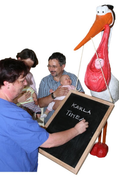 Die Wiese ist nicht das Areal, auf dem sich der riesige Storch aufhält. Er trägt zwar „rote Strümpfe” und hat ein „schwarzweiß Röckchen an”. Er watet nicht durch die Sümpfe, sondern wartet auf frische Mitteilungen aus dem Kreissaal. Er steht in der Empfangshalle der HELIOS Kliniken Schwerin (Haus 0) und trägt eine Tafel um den langen Hals. Auf dieser sind die Geburten des Tages für alle Patienten und Besucher mit Namen und Uhrzeit zu lesen. Also dann: Möge die Tafel immer dicht beschrieben sein!