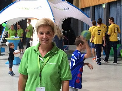 BARMER GEK am Rande des Handballspiels der Mecklenburger Stiere gegen die 2. Mannschaft der SG Flensburg/Handewitt Anfang Oktober. Dazu baute die Krankenkasse ihren Kinderturntest auf.