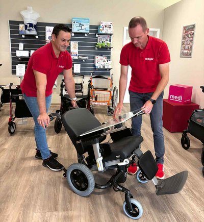 Gern führen er und sein Kollege Marco Grunenberg Interessierten das Modell im Sanitätshaus Kowsky vor. Dann können Kunden auch die verschiedenen Positionsierungsmöglichkeiten testen, die diesen Rollstuhl ausmachen. Der „Breezy Ibis“ hat eine 30-Grad-Neigungseinstellung, die sich durch den Betreuer oder den Nutzer selbst einfach bedienen lässt.