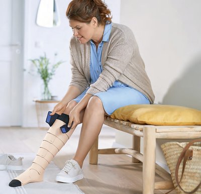 Das System ReadyWrap ist hier ein gutes Beispiel. Es ersetzt Bandagen, die regelmäßig gewickelt werden müssen. Denn Kompression ist nicht gleich Kompression: Bei der Behandlung von Ödemen gibt es ganz unterschiedliche Bedürfnisse. In der so genannten Entstauungsphase kann noch kein Kompressionsstrumpf angemessen werden. „Gerade bei starken Wasser- und Lympheinlagerungen im Gewebe muss die Flüssigkeit erst herausgepresst werden, sonst ist der Strumpf ja schnell wieder zu weit“, sagt Kowsky-Mitarbeiterin Susanne Reichelt. Auch bei offenen Beinen sind Kompressionsstrümpfe keine Option.