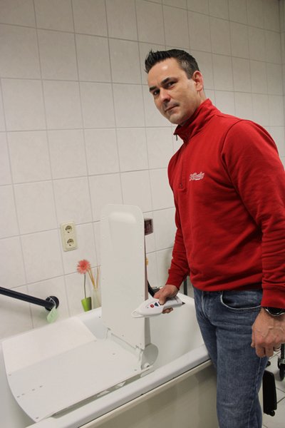 Zum Glück gibt es schnelle und praktische Hilfe. Das Sanitätshaus Kowsky bietet eine große Auswahl von Hilfsmitteln an, die ohne bauliche Veränderungen das Bad barrierefrei machen. Gerade dieser Raum ist oft in der Wohnung der neuralgische Punkt für Menschen mit eingeschränkter Mobilität: Schmale Türen, wenig Fläche, kaum Aktionsradius. Das ist einer der Gründe, weshalb Reha-Techniker Marco Grunenberg die Kunden gern bei Hausbesuchen berät: So kann er für jedes Problem eine individuelle Lösung finden. Ziel ist dabei immer, dass die Menschen so lange es geht zu Hause leben und zu Hause versorgt werden können. Oft staunen die Kunden selbst, wie schnell sich mit den Hilfsmitteln Lebensqualität und Sicherheit zurückgewinnen lassen. „Ach, das war‘s schon?“, bekommt Marco Grunenberg häufiger zu hören, wenn er zum Beispiel den zusammenklappbaren Badewannenlifter mit Akku-Antrieb einfach in die Wanne hineinstellt und dieser gleich benutzt werden kann. Zu den praktischen Hilfen rund um die Badewanne gehören außerdem ein Badewannen-Drehsitz und ein Einhängesitz, ein Badewannenbrett sowie Haltegriffe, die an der Wand und am Wannenrand angebracht werden.