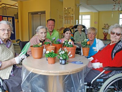 Wohnpark Zippendorf der Flora ein wenig auf die Sprünge – mit dem traditionellen Frühlingserwachen: Bewohner, Mitarbeiter und Lehrlinge pflanzten gemeinsam Hornveilchen, gestalteten Tisch-Blumendekorationen, schmückten Sträucher mit Ostereiern, verschönerten Terrassen. In gemischten Gruppen eiferten sie dabei um den Wanderpokal des Wohnparks, wobei auch Teamarbeit und die Kommunikation mit den Bewohnern bewertet wurden.