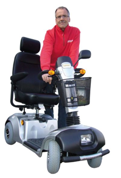 Ins Schwärmen gerät Gerd Sommer, der den geriatrischen Bereich des Hauses leitet, beim Anblick des Scooter-Modells „Esprit“. „Der sieht besser aus als ein Rollstuhl und vermittelt weniger das Gefühl, krank zu sein. Durch das Lenkrad ist es ein wenig wie Autofahren. Mit dem Scooter kann man sich bequem bei 6 km/h auf dem Bürgersteig fortbewegen. Wer zu uns rauskommt, kann gerne Probe fahren. Wir bieten das qualitativ hochwertige Modell auch weiterhin zu unserem Messepreis von 1500 Euro an und wir helfen dabei, gleich die passende Rampe zu beantragen. Manche Wohnungsgesellschaften stellen auf Anfrage sogar Schuppen vor der Haustür auf.“