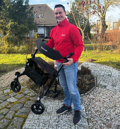 Dabei vereint das neue Hilfsmittel gleich mehrere Vorteile: „Das Modell ist sehr leicht, wiegt nur 5,5 Kilogramm“, sagt Kowsky-Mitarbeiter Marco Grunenberg. Außerdem verfügt es standardmäßig über einen Gehstockhalter und einen gepolsterten Rückengurt. Letzterer kommt Nutzern zugute, wenn sie unterwegs eine Pause einlegen und den Rollator dabei als Sitzgelegenheit nutzen. Wie alle Leichtgewichtsrollatoren ist das Modell zusammenklappbar und kann im Hausflur oder in der Wohnung platzsparend abgestellt werden. Reflektoren erhöhen bei Dämmerung die Sicherheit – und wer mit dem Rollator zum Supermarkt geht, kann Einkäufe in einer geräumigen Netztasche verstauen. Ein Plus ist laut Marco Grunenberg auch die Gummibereifung des rollenden Hilfsmittels. Die sorgt nämlich dafür, dass Nutzer bei ganz unterschiedlichen Bodenverhältnissen sicher vorankommen. Geeignet ist der Rollator sowohl für die Wohnung als auch für den Außenbereich.