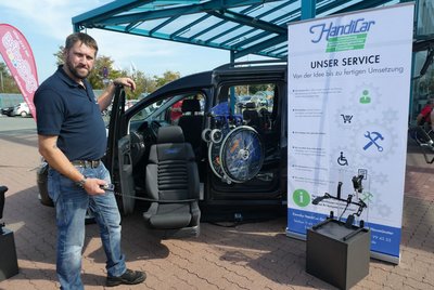 Das Sanitätshaus Kowsky hatte im September zu einem Mobilitätstag auf den Parkplatz des Sieben Seen Centers eingeladen. Unter anderem zeigten Vertreter des Kfz-Umbaubetriebs HandiCar, hier der Kfz-Meister Marcus Harner, wie sich Autos rollstuhlgerecht gestalten lassen. Welche Möglichkeiten die Umbauten eröffnen, konnte auch gleich vor Ort ausprobiert werden.