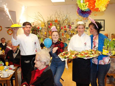 Zum Auftakt des gemütlichen Frühstücks im Gemeinschaftsraum sangen alle ein fröhliches Osterlied. Das Büfett gestalteten die Wohnparkköche Regina und René mit viel Liebe und Kreativität. Sie präsentierten dann die kalten Platten unter viel Beifall mit einem kleinen Feuerwerk.